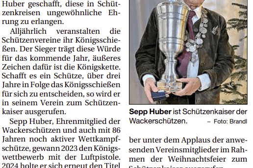 Noch nie hatten die Wackerschützen – vor 95 Jahren eine der fünf Gründungsabteilungen des SV Wacker – einen Schützenkaiser. Nun hat es Sepp Huber gesc…