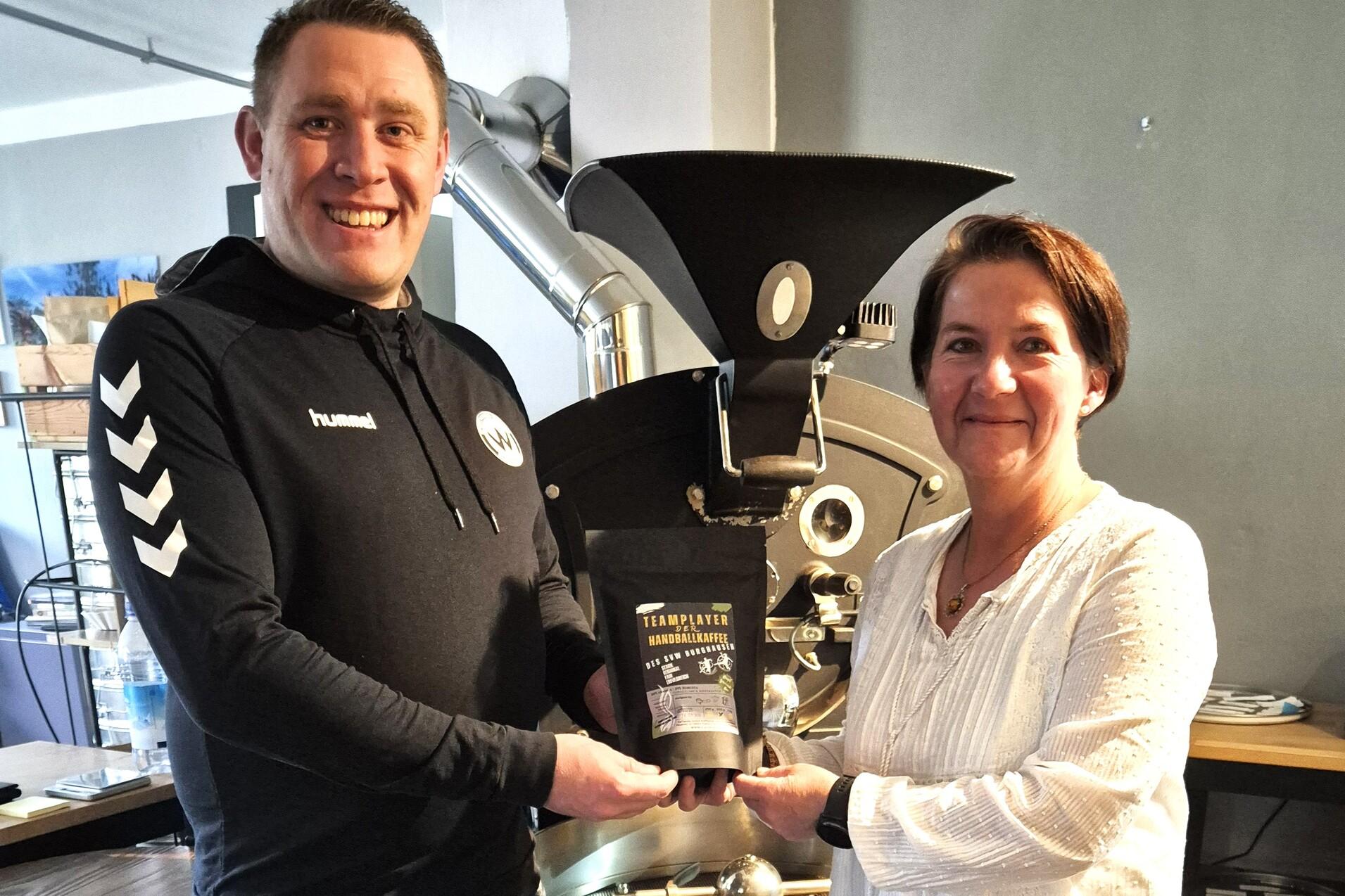 Elke Gäbelein-Nitzl, Geschäftsführerin der CaTienda GmbH Kaffeebar und Röstwerkstatt und Alexander Langenfaß von der Handballabteilung des SV Wacker Burghausen freuen sich über die zukünftige Partnerschaft sowie über das gemeinsame Projekt TEAMPLAYER – DER HANDBALLKAFFEE.