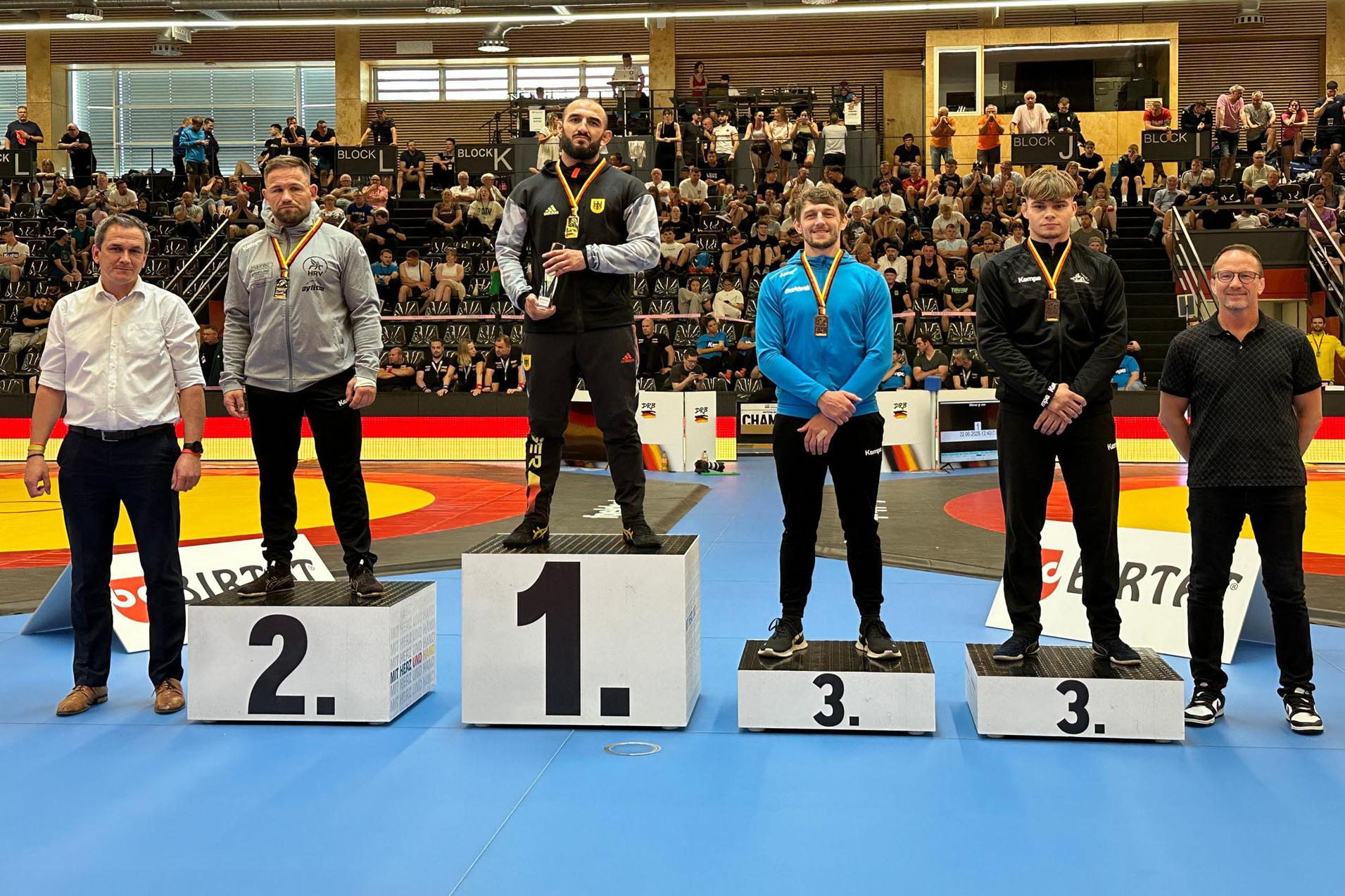 Auch Idris Ibaev konnte heuer seinen dritten Titelgewinn bei Deutschen Einzelmeisterschaften feiern. Nach technischen Überlegenheitssiegen gegen Maximilian Rettinger (KSV Aalen 05) und Quentin Scherer (KSV Waldaschaff) musste er im Halbfinal-Kampf gegen Radu Placinta (TKSV Hückelhoven) erstmals an seine Grenzen gehen. Placinta erwies sich als überaus hartnäckiger Gegner, der Ibaev in beeindruckendem Maß Gegenwehr leistete. Am Ende setzte sich der Burghauser aber dann doch klar nach einem sehenswerten Ausheber in der zweiten Runde mit 8:2 nach Punkten durch, sodass es im Finale zum Duell der beiden aktuell stärksten Ringer dieser Gewichtsklasse kam. Mit Aaron Bellscheidt (KSK Neuss) bekam Ibaev im Finale die sicherlich härteste Nuss vorgesetzt, die es im gesamten Turnierverlauf zu knacken galt. Von Beginn an machte Bellscheidt Druck und zwang Ibaev in die Defensive. Doch kurz bevor die Kampfrichter Ibaev in die Bodenlage schicken wollte, gelang ihm die kampfentscheidende Aktion: nach einem „Herumreißer“ konnte er seinen Gegner aus dem Mattenkreis befördern und ging damit mit einer 1:0-Führung in die Pause. Zwar gelang Aaron Bellscheidt noch der 1:1 Ausgleich, doch dies änderte nichts an Ibaevs Sieg. Denn der Deutsche Ringerbund übernahm im Rahmen der Deutschen Meisterschaften zum ersten Mal eine vom Weltverband neu eingeführte Regeländerung, die besagt, dass bei Mattengefechten im griechisch-römischen Stil bei einem 1:1 nicht wie bisher die zuletzt erzielte Wertung den Sieg bringt, sondern die erste Wertung.