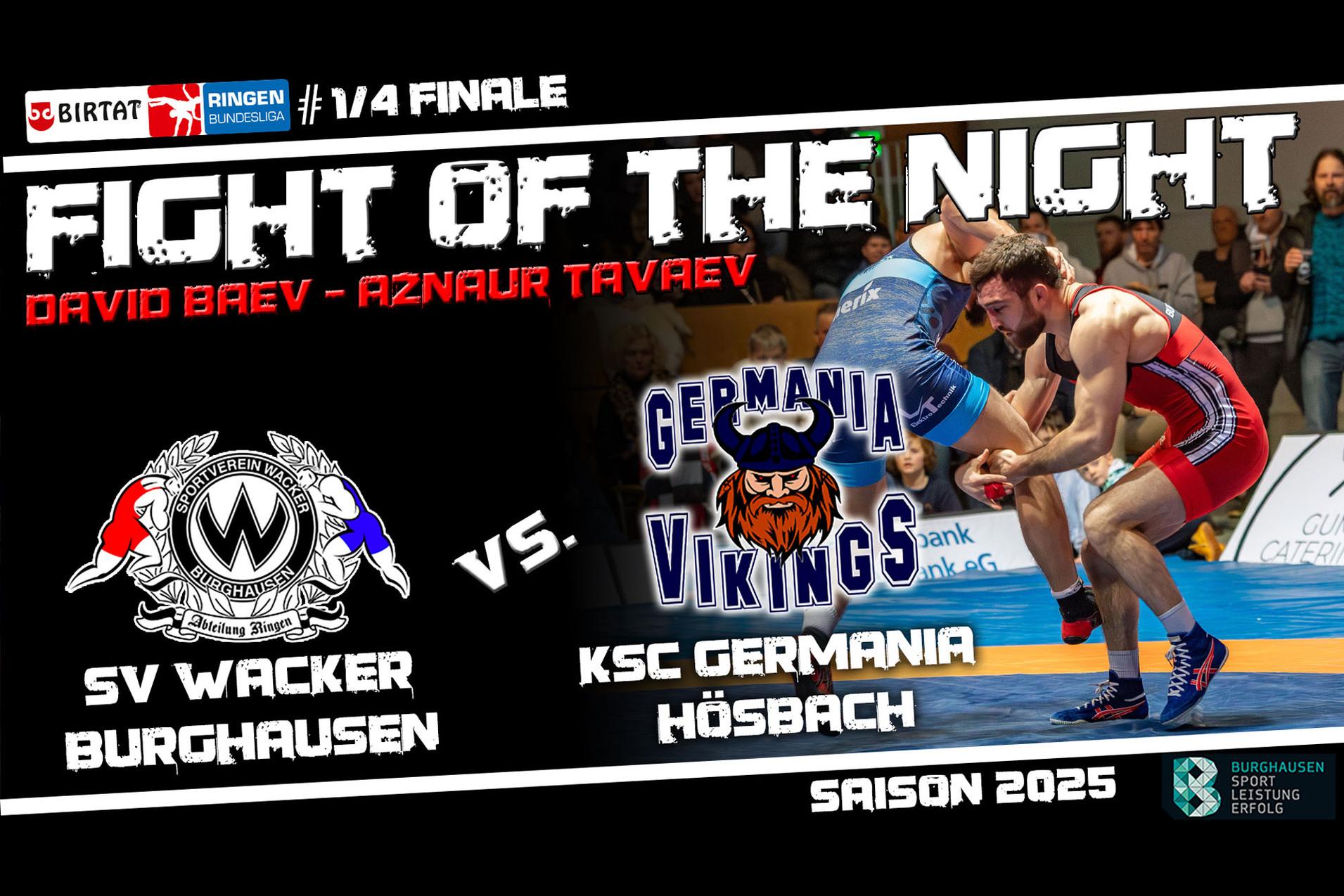 Erlebt den „Fight of the Night“ – das spektakulärste, spannendste oder dramatischste Duell jedes Heimkampfabends. Der „Fight of the Night“, viele YouTube-Shorts und auch ganze Kampfabende findest du auf dem Burghauser YouTube-Kanal, Auszüge davon auch auf Facebook und Instagram. Viel Spaß beim Fight of the Night des Viertelfinal-Rückkampfs zwischen David Baev und Aznaur Tavaev.