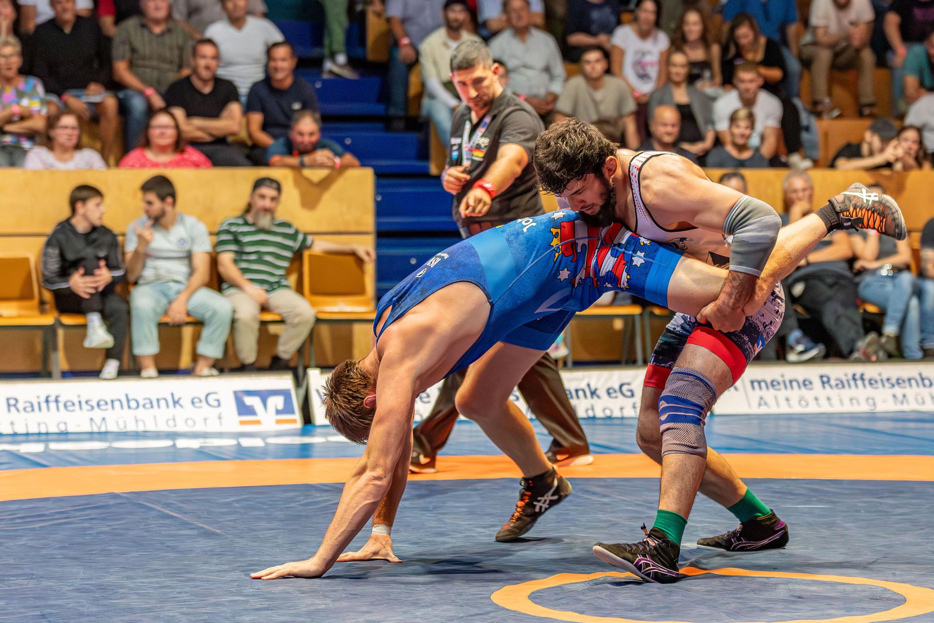 Gleich zum Auftakt bekam es Givi Davidovi mit dem deutschen Spitzenringer Niklas Stechele zu tun, gegen den er bereits in der letzten Saison den Kürzeren zog. Und auch dieses Mal hatte der Italiener im Burghauser Dress mit den langen Armen und damit der höheren Reichweite seines Gegners seine liebe Mühe. Am Ende setzte sich Stechele mit 3:0 nach Punkten durch und sorgte so für einen positiven Einstand für die Gastgeber in den Kampftag. Nicht viel besser lief es für Ramsin Azizsir im Schwergewicht, der es mit Ilja Klasner zu tun bekam. Nachdem der Kleinostheimer mit einer 3:0 Halbzeitführung in die Pause ging, schaltete Azizsir im zweiten Kampfabschnitt ein Gang höher und kam nach einer angeordneten Bodenlage zum 3:3 Ausgleich. Doch das Glück sollte dem Burghauser am Ende nicht hold sein - nach einem Stolperer beförderte Klasner den Burghauser aus der Mattenbegrenzung und sicherte sich so den entscheidenden Punkt zum 4:3-Punktsieg. Keinen Auftrag hatte hingegen Fabian Schmitt gegen den Kleinostheimer Neuzugang Justus Petravicius. Das aus Litauen stammende Leichtgewicht machte Schmitt über die gesamte Kampfdauer das Leben schwer. Vor allem, dass Schmitt seine Chance in der Bodenlage der ersten Runde nicht nutzen konnte, wurmte den Franken im Wacker-Dress sichtlich. In der zweiten Runde wurde der zu Offensive genötigte Schmitt ein ums andere Mal vom defensiv stabil stehenden Petravicius ausgekontert, sodass am Ende ein deutliches 11:2 zu Gunsten der Gastgeber zu Buche stand, das den eigentlich knappen Kampfverlauf nicht widerspiegelt. Den ersten Hoffnungsschimmer für den SV Wacker Burghausen gab es im anschließenden Vergleich der Klasse bis 98kg Freistil, in der Burghausens Akhmed Magamaev auf den amtierenden Deutschen Meister Johannes Mayer traf. Gleich zu Beginn schienen die Chancen auf einen Burghauser Sieg zu schwinden, denn mit der ersten Aktion sicherte sich Mayer nicht nur die erste Wertung, Magamaev, der bereits sichtlich an Knie und Ellenbogen lädiert in den Kampf ging, zuckte förmlich zusammen, nachdem ihm ein Muskel im unteren Rücken zumachte. Doch dafür fand Magamaev eine schnelle und effektive Lösung: beim zweiten ungestümen Angriff Mayers konterte Magamaev seinen Gegner aus schulterte ihn eiskalt - ein wichtiger Moment, um die aufgeheizte Atmosphäre in der Halle merklich abzukühlen. Doch im letzten Kampf vor der Pause folgte in der 66kg-Klasse noch ein weiterer Dämpfer für den Burghauser Tross: Im Gefecht der beiden Jungspunde Marcel Wagin und Magomed Kartojev war es am Ende der Wackerianer, der trotz starker kämpferischer Leistung im Duell zweier gleichwertigen Athleten eine bittere 6:0 Niederlage hinnehmen musste. Damit ging es mit 8:4 zu Gunsten der Gastgeber in die Pause.