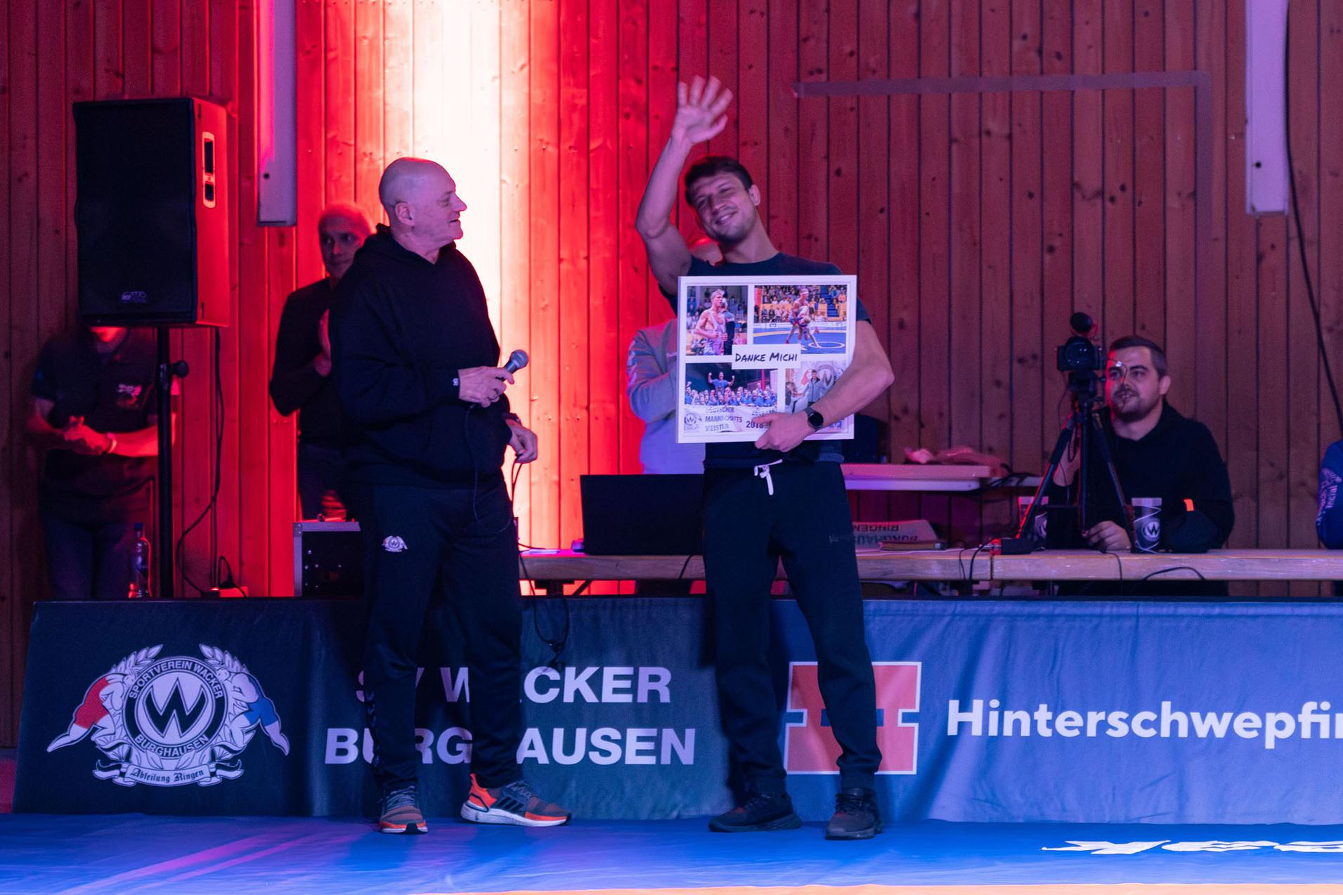 Bevor es auf der Matte mit den Kämpfen losging, stand jedoch ein besonders emotionaler Moment auf dem Programm. Abteilungsleiter Jürgen Löblein ließ es sich nicht nehmen, einen Sportler zu verabschieden, der über acht Jahre lang das Wacker-Trikot getragen hat und inzwischen für den heutigen Gegner, den KSC Hösbach, aufläuft. Michael Widmayer, zweifellos einer der größten Kämpfer, die jemals im Dress des SV Wacker Burghausen auf der Matte standen, wurde für seine außergewöhnlichen Verdienste noch einmal gebührend geehrt. Fünfmal Deutscher Mannschaftsmeister mit dem SV Wacker Burghausen, 5. Platz Weltmeisterschaft 2019 sowie 5. Platz Europameisterschaft 2021 – eine Bilanz, die für sich spricht. Ein Athlet, der im wahrsten Sinne des Wortes sein letztes Hemd für den Verein gegeben hat, wurde unter tosendem Applaus der Zuschauer verabschiedet und erhielt die Anerkennung, die er sich über Jahre hinweg mit Kampfgeist, Leidenschaft und bedingungslosem Einsatz für den SV Wacker verdient hat.
