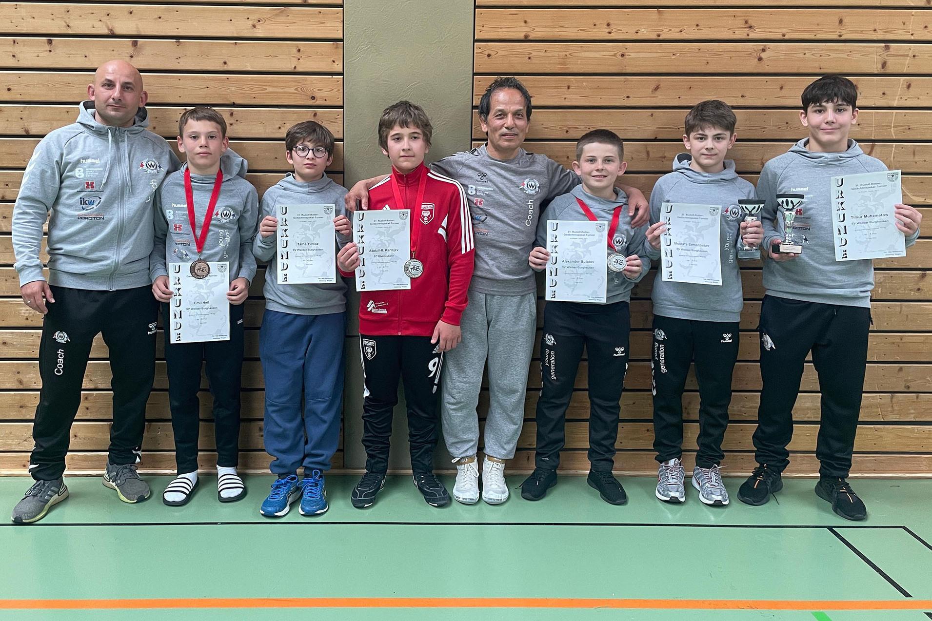 Alle fünf Wackerianer gingen in der Altersklasse der U13 an den Start und sahen sich mit einem stark besetzten Teilnehmerfeld konfrontiert. Im Limit bis 38kg schickte der SVW mit Talha Yilmaz und Emil Heß gleich zwei hoffnungsvolle Starter ins Rennen. Im Pool A gelangen Yilmaz zwei vorzeitige Siege gegen Michael Soller (SC Isaria Unterföhring) und Adrian Constantin (SC Oberölsbach). Während er Soller technisch überlegen auspunkten konnte, gelang Yilmaz gegen Constantin ein Schultersieg. Im entscheidenden Kampf um den Finaleinzug gab es jedoch gegen Masis Kirkoroglu (SV Johannis Nürnberg) nichts zu holen – trotz einer starken kämpferischen Leistung musste sich der Burghauser am Ende mit 4:12 klar nach Punkten geschlagen geben. Ähnlich verlief das Turnier für Emil Heß, der im Pool B mit zwei Schultersiegen gegen Moritz Stockhausen (TSV 1860 Weißenburg) und Daniel Renz (SV Johannis Nürnberg) startete. Doch auch ihm blieb der Finaleinzig verwehrt, nachdem er gegen Alexander Siebert (SC 04 Nürnberg) nicht über die Zeit kam. So trafen die beiden Burghauser Ringer im Kampf um Platz 3 im direkten Vergleich aufeinander. Am Ende setzte sich Emil Heß nach einer starken und konzentrierten Leistung mit 4:1 nach Punkten gegen seinen Mannschaftskameraden durch und sicherte sich damit die Bronzemedaille. Talha Yilmaz verpasste hingegen die Medaillenränge auf dem vierten Platz nur um Haaresbreite.