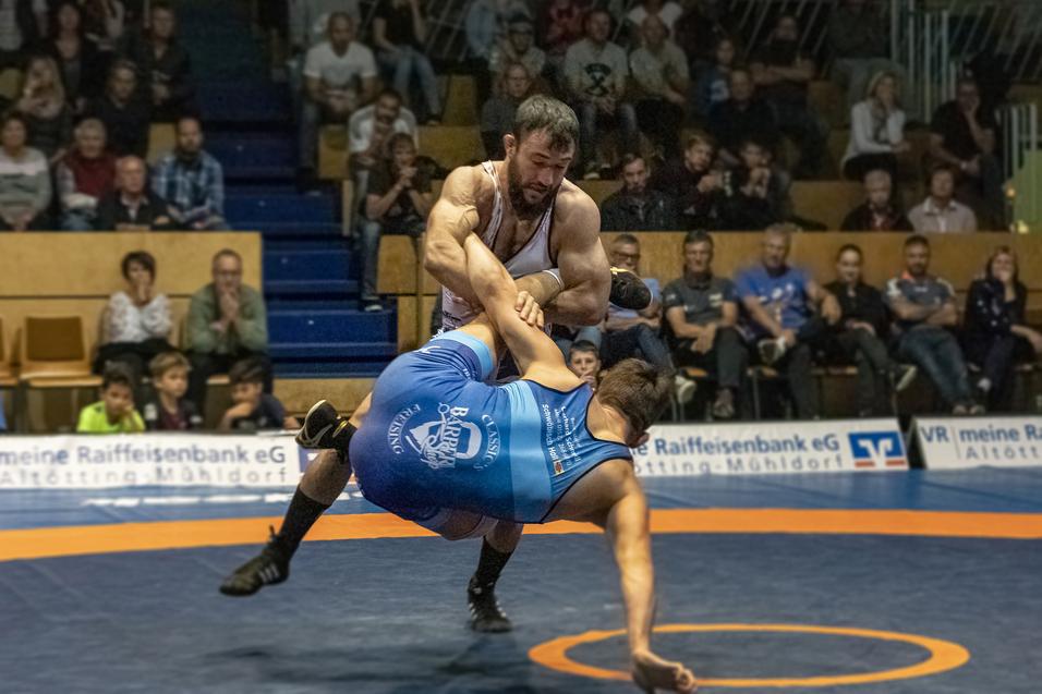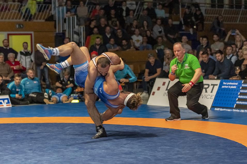 Mit einem ungefährdeten 8:0 gegen den sich tapfer wehrenden Georg Harth eröffnete Kakhaber Khubezhty den zweiten Teil des Abends, ehe in der Freistil-Klasse bis 71 Kilogramm zwischen Erdogan und Gebekov der Kampf geboten wurde, der allein das Eintrittsgeld wert war – ein wahres Fest der Freistilkampf-Kunst mit all seinen Facetten. Wenig Mühe hatte anschließend in der Greco-Klasse bis 80 Kilogramm Roland Schwarz bei seinem Überlegenheitssieg nach 2:20 Minuten gegen TuS-Eigengewächs Sascha Keller, deutlich umkämpfter war dann das Greco-Welter zwischen Michael Widmayer und dem bärenstarken Kroaten Dominik Etlinger, das der EM-Dritte von 2019 mit 7:1 gewann. „Man hat schon gesehen, dass Michi nach seiner langen Verletzung noch ein paar Prozent fehlen, aber wichtig war, dass er schon mal auf der Matte war, ehe es in die Halbfinal-Kämpfe geht“, attestierte Urgestein Matthias Maasch Widmayer bei seinem Comeback eine ansprechende Leistung. Den Schlusspunkt setzte der ehemalige Adelhausener Ali-Pasha Umarpashaev mit einem 15:0 gegen den überforderten Mirco Kuder.